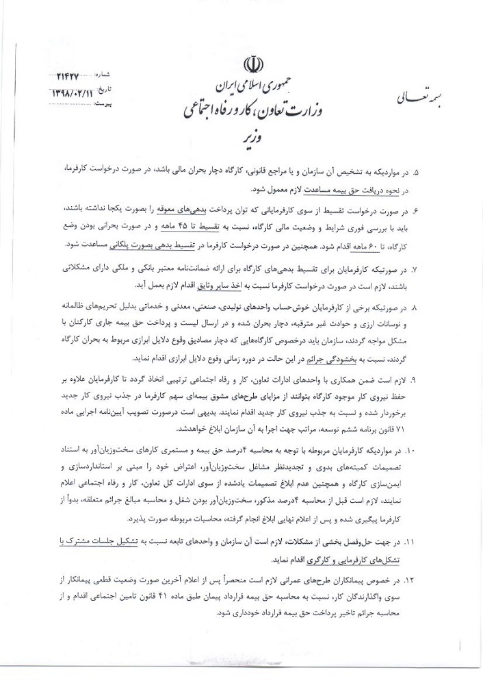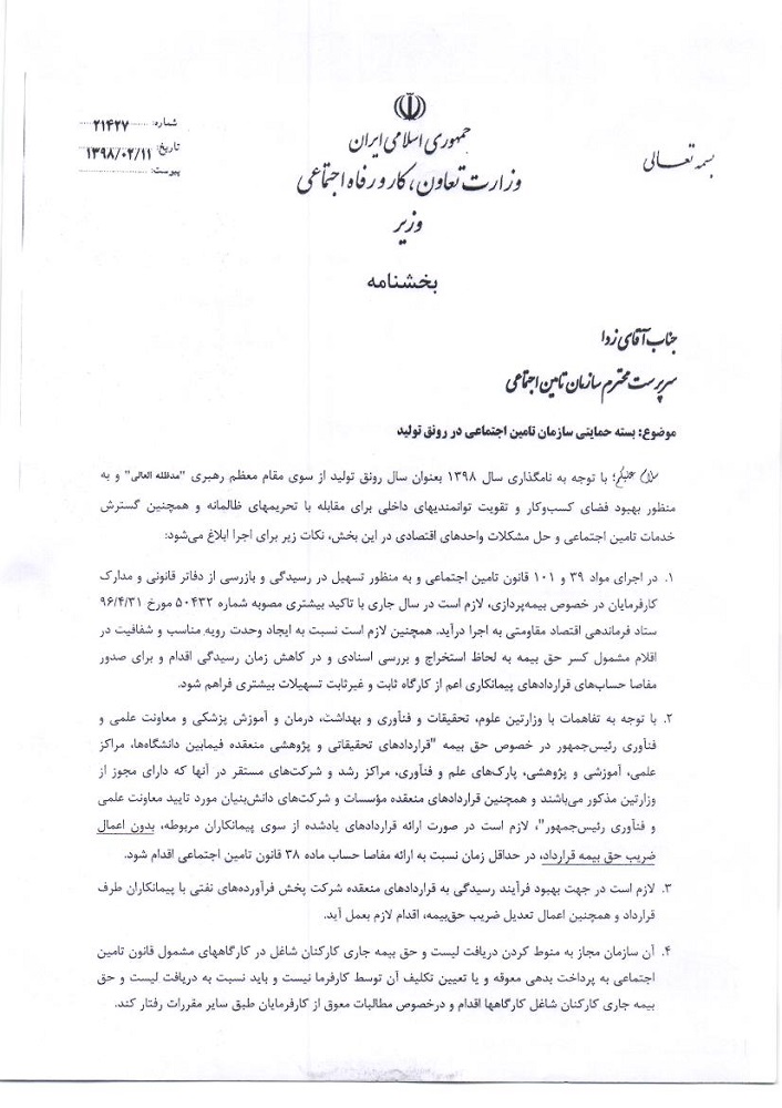 وزیر تعاون، کار و رفاه اجتماعی، بسته حمایتی سازمان تأمین اجتماعی در رونق تولید را در قالب یک بخشنامه ابلاغ کرد.