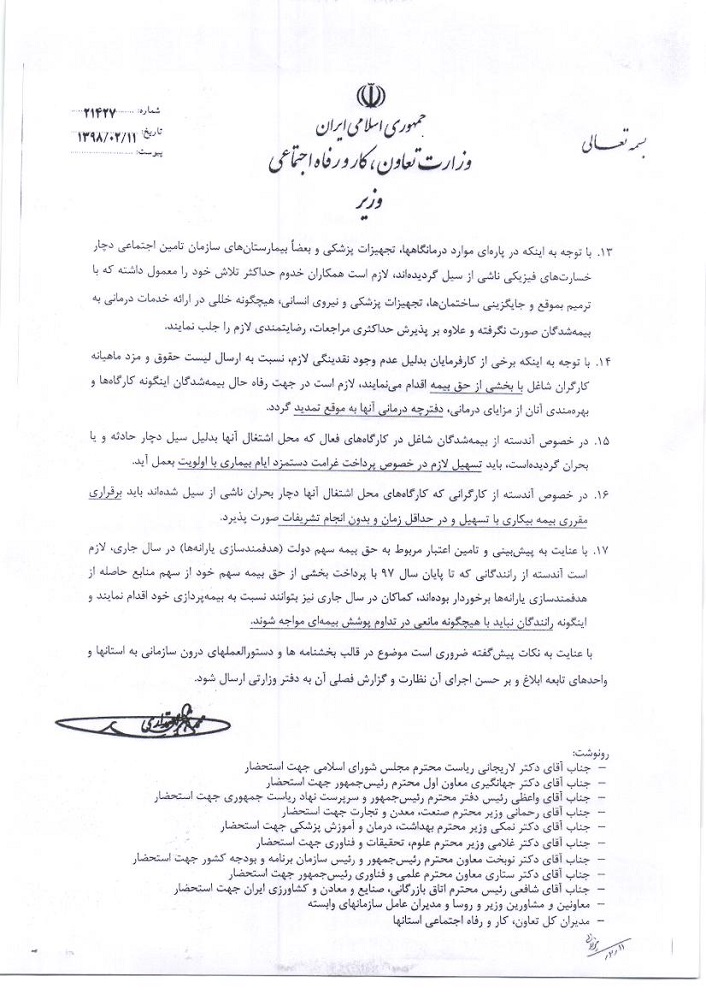 همچنین در این بخشنامه موضوع بخشودگی جرائم کارفرمایان خوش‌حساب، تشویق کارفرمایان در ازای جذب نیروی کار جدید، تمدید به‌موقع دفترچه درمانی بیمه‌شدگان و تسهیل در پرداخت غرامت و مستمری بیمه‌شدگان به‌خصوص کارگران فعال در مناطق سیل‌زده نیز مورد تأکید قرار گرفته است.